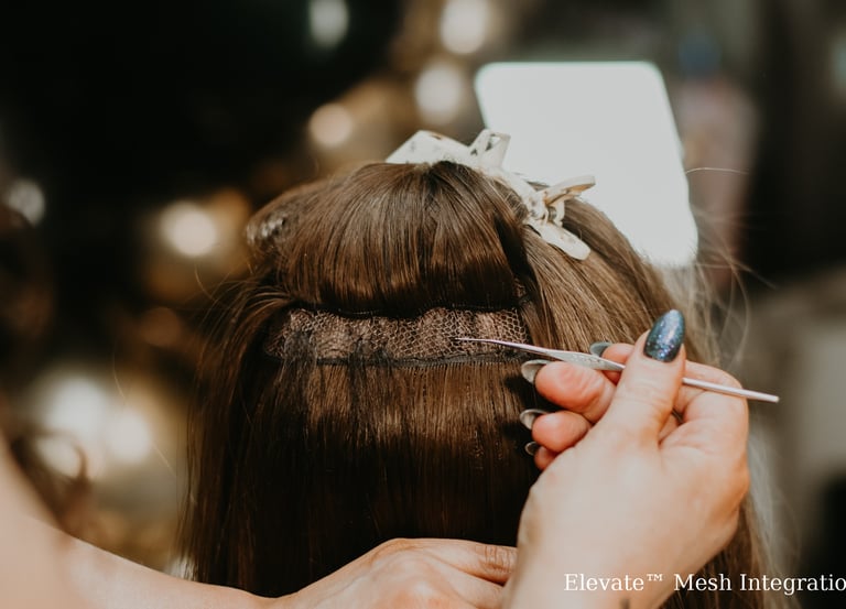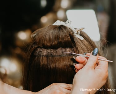 Using a customized mesh piece as a baseline for beadwork, we are able to add toppers and/or extensions to a clients hair without risk of added weight or damage to their hair or scalp